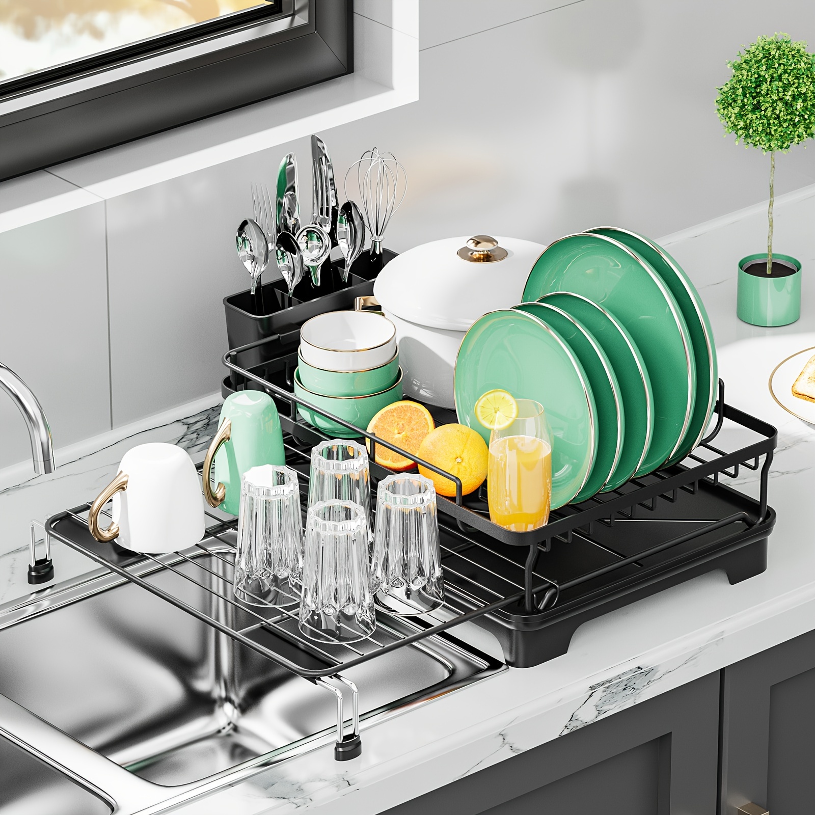 Storico Large Dish Drying Rack – Extendable Dish Rack for Kitchen Counter with Utensil Holder, Effective Drainage & Rustproof Design (Black)